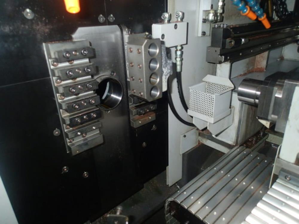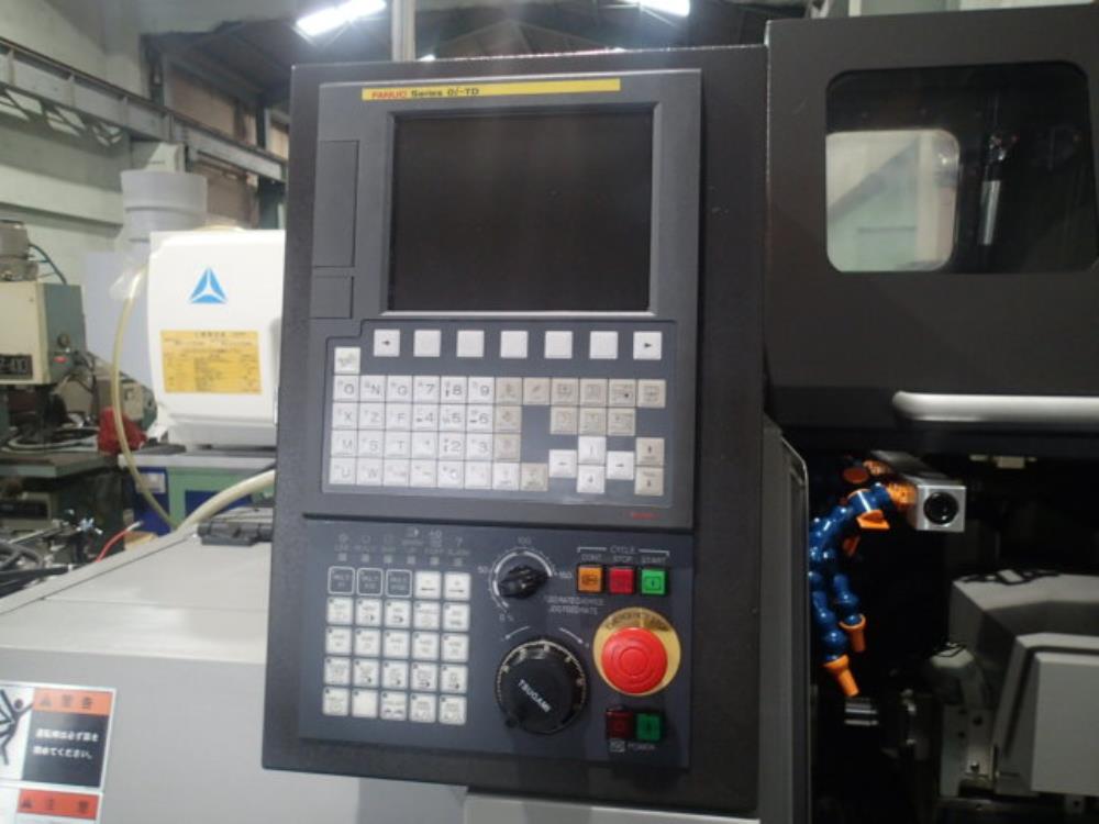 FANUC 0i-TD 把握棒材径φ3-φ20 最大加工長45mm(ガイドブッシュレス) 主軸最大穴明け径φ10 最大ねじ立径M10x1.5 背面主軸最大穴明け径φ8 背面主軸最大ねじ立径M8x1.25 主軸1000rpm 背面主軸12000rpm 工具取付13本 パーツフィーダー ミストコレクター