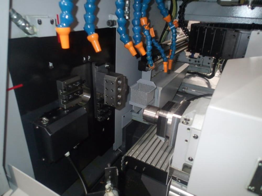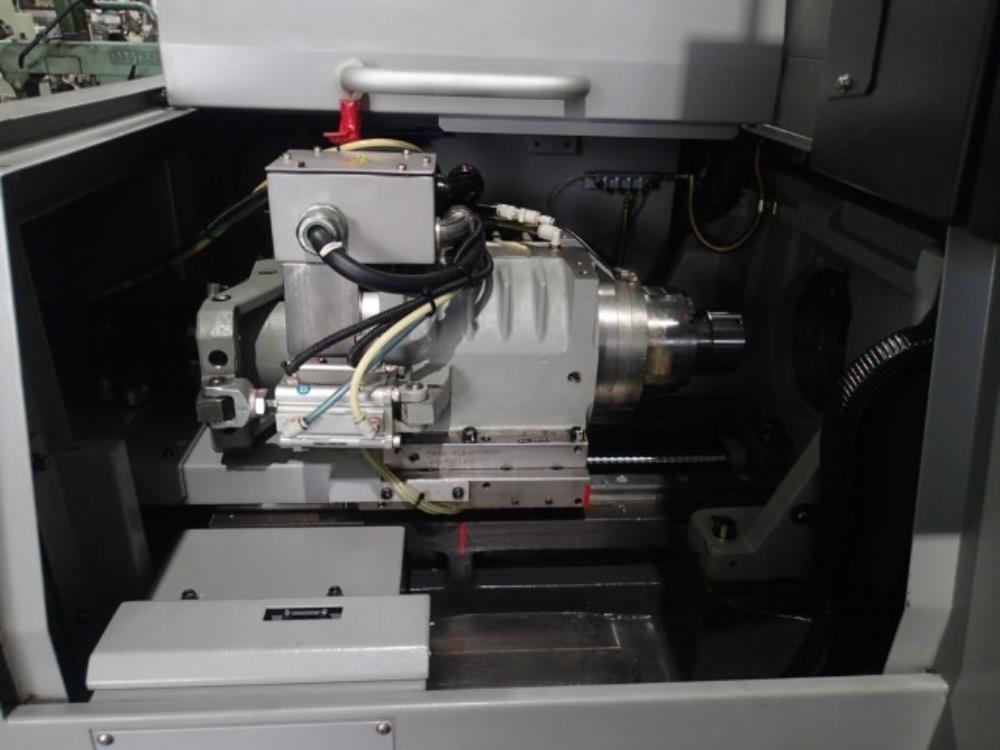 FANUC 0i-TD 把握棒材径φ3-φ20 最大加工長45mm(ガイドブッシュレス) 主軸最大穴明け径φ10 最大ねじ立径M10x1.5 背面主軸最大穴明け径φ8 背面主軸最大ねじ立径M8x1.25 主軸1000rpm 背面主軸12000rpm 工具取付9本 3軸クロスドリル パーツフィーダー ミストコレクター