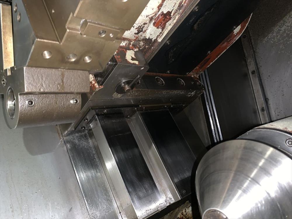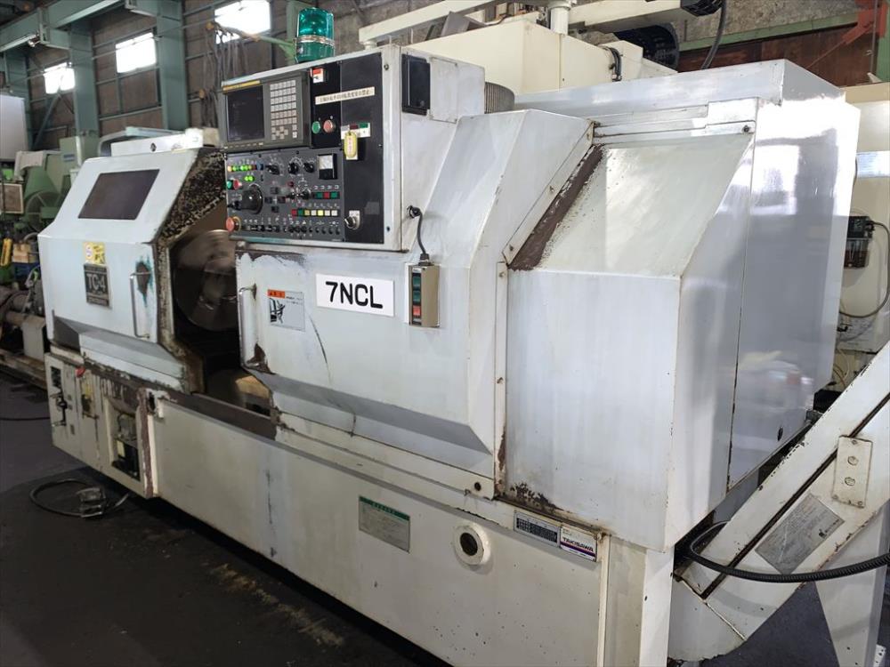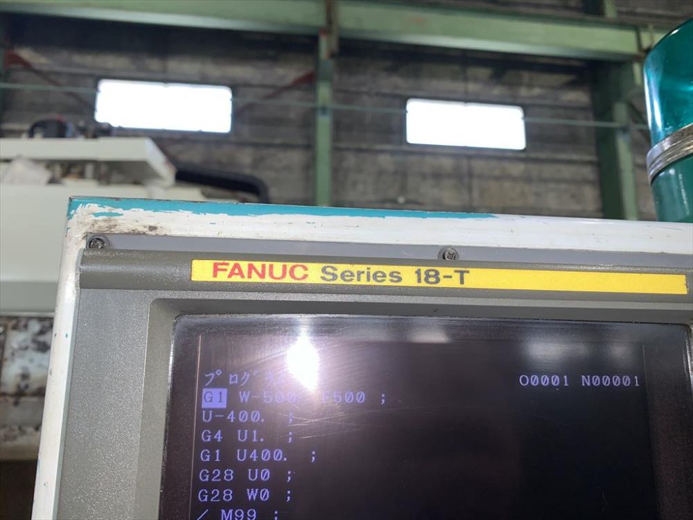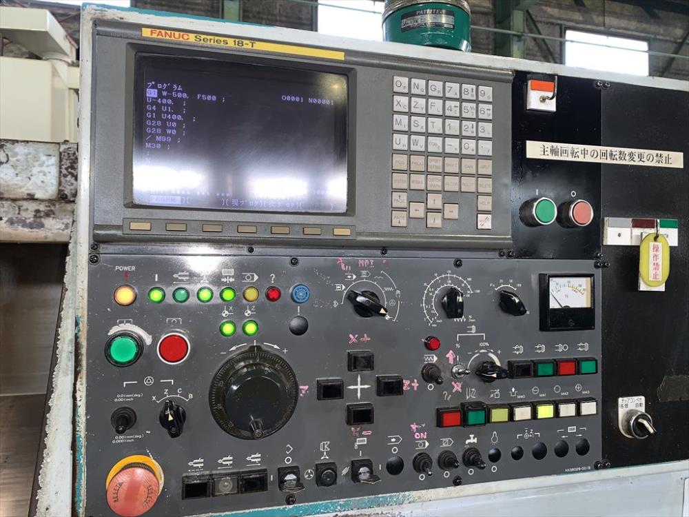 FANUC-18T 中実チャックφ450(北川N-18)X/Zストローク: 250/1100 ベッド上振りφ600 最大加工径φ450 最大加工長1020 主軸2500rpm 10角タレット 右出しチップコン